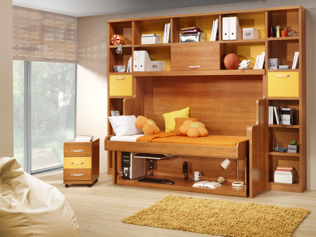 А есть двухэтажные модели, в которых на первом этаже письменный стол, а на втором – спальное место. Это варианты подойдут для малогабаритных квартир.