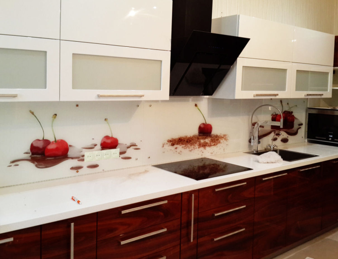 Тем не менее, ни дороговизна, ни сложность изготовления ничуть не умаляют достоинств стеклянного фартука с нанесенным на него изображением. Для справки. Фартук из стекла можно украсить не только фотопечатью, но и пескоструйным рисунком. Каждый из этих декоров наносится на изнаночную сторону стеклянной панели, поэтому повредить их невозможно.