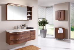 Второй вариант – если у вас получилось подобрать тумбы в ванную комнату, сочетающуюся по стилистике с отделкой стен и другой мебелью. Это безусловно будет идеальный вариант. Дорогая мебель для ванной обычно отличается более благородными и надежными материалами, но по функциональности не слишком расходится с самыми дешевыми вариантами.